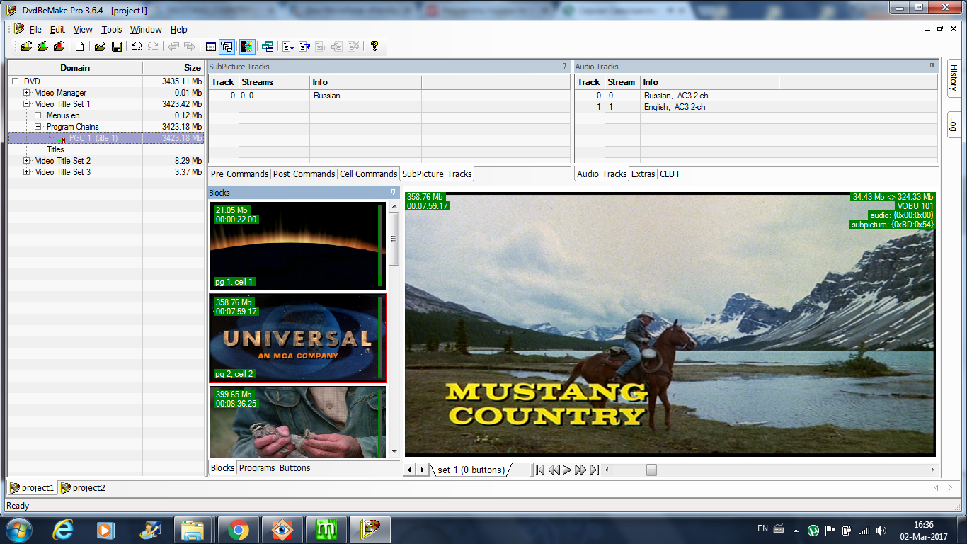 16:9 NTSC R1 Слоган: «Wilderness Splendor and Animal Fury» Страна: США Студия: Universal Pictures Жанр: вестерн Год выпуска: 1976 Продолжительность: 01:19:24 Перевод: Одноголосый закадровый - Евгений Малиновский Cубтитры: русские(adamovna, Евгений Малиновский) Оригинальная аудиодорожка: английский Режиссер: Джон С. Чемпион / John C. Champion В ролях: Джоэл МакКри, Роберт Фуллер, Патрик Уэйн, Ника Мина Описание: Красочный фильм снятый в красивейших местах национального парка Банф (провинция Альберта, Канада), с неторопливо развивающимся действием. Охотясь за неуловимым мустангом, старый ковбой, бывшая звезда родео, встречает индейского мальчика-сироту, объединившись в своей цели они используют множество уловок для поимки вороного красавца. Но тот слишком умен и поймать его совсем не просто .. Доп. информация: Диск собран из Mustang Country_(1976)_DVD5_R1 найденного в сети. (Который на постере) Бонусы: Фотогалерея, постеры. Меню: Статичное, неозвученное на английском.Меню неотредактировано, переключение звуковых дорожек и субтитров с пульта. Фильм автоматически стартует с рус. звук. дорожкой.-- --Фильм переведен и озвучен специально для: 7букв Вестерн / группа Джесси Джеймса Отдельная благодарность Alassea за предоставленную русскую звуковую дорожку и субтитры. Перевод: adamovna, Евгений Малиновский. Закадровый текст: Евгений Малиновский.--Mustang Country_(1976)_DVD5_R1_Sample_.rar--Тип релиза: DVD5 (Custom) Контейнер: DVD-Video Видео: NTSC 16:9 (720x480) VBR Auto Letterboxed, ~ 6028.06 kbps avg Аудио 1: Russian, AC3, 2/0 (L,R) ch, 192 kbps, Delay 0 mSec Аудио 2: English, AC3, 2/0 (L,R) ch, 192 kbps, Delay 0 mSec Формат субтитров: prerendered (DVD/IDX+SUB) DVDaInfoTitle: Mustang Country_(1976)_DVD5_R1Size: 3.35 Gb ( 3 517 556,00 KBytes ) - DVD-5 Enabled regions: 1, 2, 3, 4, 5, 6, 7, 8 VTS_01 : Play Length: 01:19:24 Video: NTSC 16:9 (720x480) VBR, Auto Letterboxed Audio: Russian, AC3, 2/0 (L,R) ch, 192 kbps, Delay 0 mSec English, AC3, 2/0 (L,R) ch, 192 kbps, Delay 0 mSec Subtitles: Russian VTS_02 : Play Length: 00:00:00+00:00:11+00:00:01 Video: NTSC 16:9 (720x480) VBR, Auto Pan&Scan Audio: English (Dolby AC3, 2 ch) VTS_03 : Play Length: 00:00:50+00:02:30+00:00:20+00:00:02+00:00:30 Video: NTSC 16:9 (720x480) VBR, Auto Letterboxed Subtitles: English * Menus Information * VIDEO_TS Menu Video: NTSC 16:9 (720x480) VBR Auto Letterboxed English Language Unit : Title Menu VTS_01 Menu Video: NTSC 16:9 (720x480) VBR Auto Letterboxed English Language Unit : Root Menu VTS_02 Menu Video: NTSC 16:9 (720x480) VBR Auto Pan&Scan Audio: Not specified (Dolby AC3, 2 ch) English Language Unit : Root Menu VTS_03 Menu Video: NTSC 16:9 (720x480) VBR Auto Letterboxed English Language Unit : Root Menu П. О.PgcDemux 1.2.0.5 - разделение компонентов диска на файлы;BeSweetv1.5b31+BeLight 0.21 - AC3 -> Wav Sound Forge pro 10 - Wav -> AC3, наложение чистого голоса на оригинал English, AC3, 2/0 (L,R) ch, 192 kbps, Delay 0 mSec, на скринах снизу чистый голос, сверху микс с анг. дорожкой. MaestroSBT-Unicode-2.6.2.1 - Создание субтитров DVDSubEdit -- Version 1.52 - Правка (цветовых схем) субтитров MuxMan DVD authoring Professional 1.4.4 - мультиплексирование и авторинг DVD; DVDRemake Pro 3.6.4 - реавторинг DVD; DVD Shrink 3.2 - Сэмпл VLC - Скриншоты- - - - - -BeSweet v1.5b31 by DSPguru. -------------------------- Using azid.dll v1.9 (b922) by Midas (midas@egon.gyaloglo.hu). Logging start : 03/01/17 , 04:42:09. BeSweet.exe -core( -input I:\Temp\MUSTANG\AudioFile_80.ac3 -output I:\Temp\MUSTANG\AudioFile_80.wav -2ch -logfile I:\Temp\MUSTANG\AudioFile_80.log ) -azid( -s mono -c normal -L -3db ) [00:00:00:000] +------- BeSweet ----- [00:00:00:000] | Input : I:\Temp\MUSTANG\AudioFile_80.ac3 [00:00:00:000] | Output: I:\Temp\MUSTANG\AudioFile_80.wav [00:00:00:000] | Floating-Point Process: No [00:00:00:000] +-------- AZID ------- [00:00:00:000] | Input Channels Mode: 2/0, Bitrate: 192kbps [00:00:00:000] | Output Stereo mode: Dolby surround 2 compatible [00:00:00:000] | Total Gain: 0.000dB, Compression: Normal [00:00:00:000] | LFE levels: To LR -3.0dB, To LFE 0.0dB [00:00:00:000] | Center mix level: BSI [00:00:00:000] | Surround mix level: BSI [00:00:00:000] | Dialog normalization: No [00:00:00:000] | Rear channels filtering: No [00:00:00:000] | Source Sample-Rate: 48.0KHz [00:00:00:000] +--------------------- [01:19:28:512] Conversion Completed ! [01:19:28:512] Actual Avg. Bitrate : 635kbps [00:01:34:000] |
